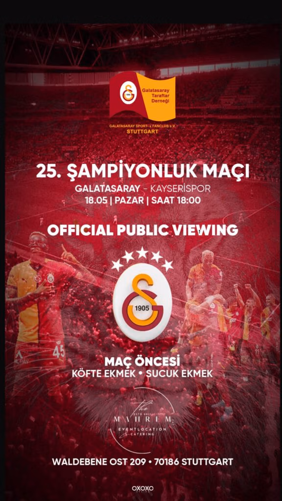 Der Galatasaray Fanclub Stuttgart lädt alle Fans herzlich zum offiziellen Public Viewing ein. Erlebe das Spiel in bester Atmosphäre, umgeben von Gleichgesinnten, die für die Mannschaft brennen.